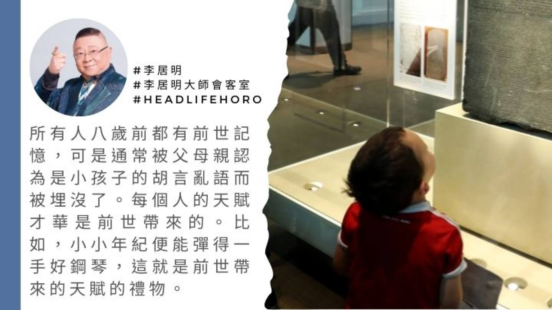 所有人八歲前都有前世記憶,可是通常被父母親認為是小孩子的胡言亂語而制衡,沒有得到認同,於是就被埋沒了。你還記得童年時的第一幅畫,你畫的是甚麼嗎?為甚麼你會畫這東西?這百分百是你前世的記憶!亦即是你前世所見,最深刻的事物。