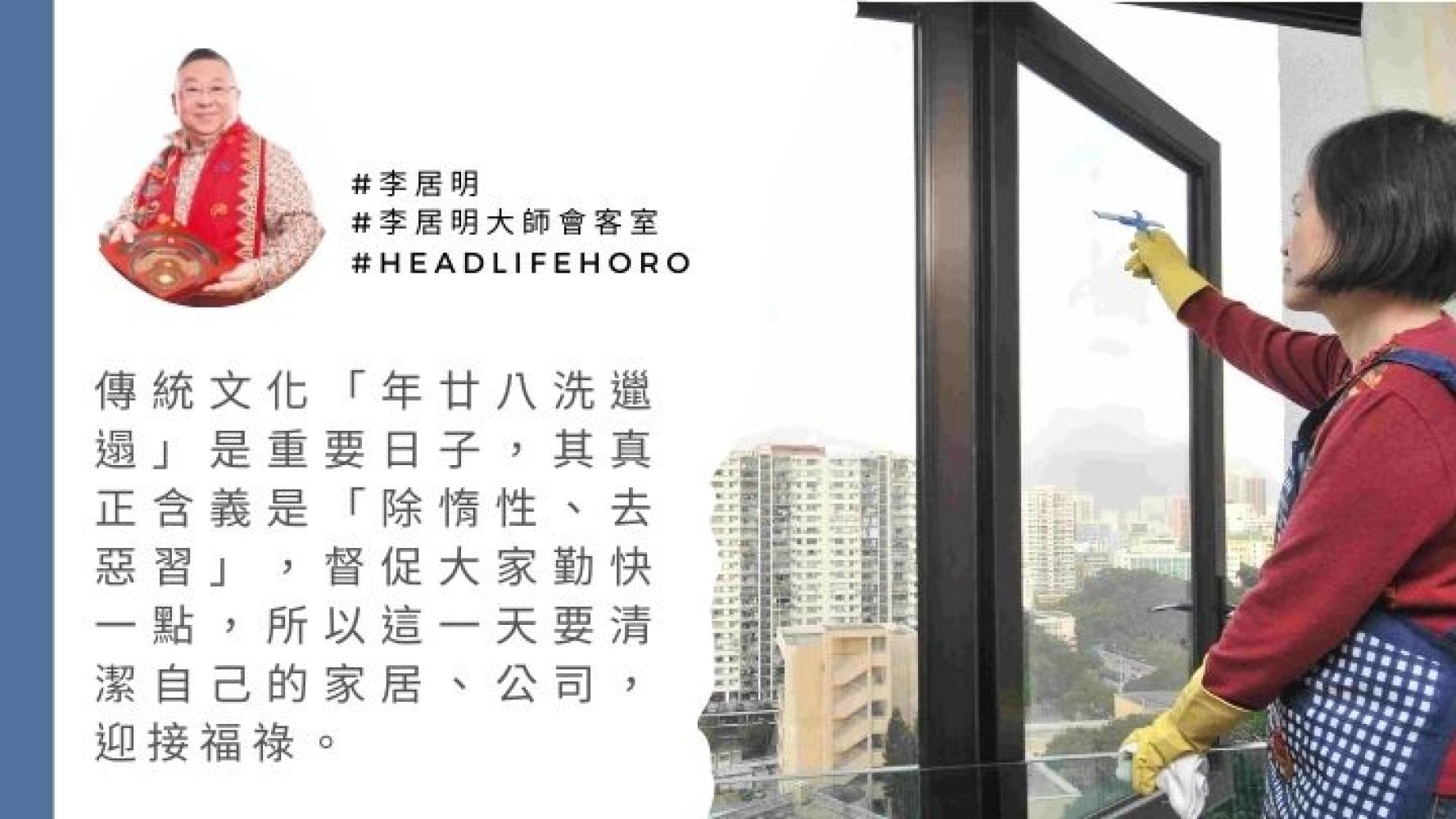傳統文化「年廿八洗邋遢」是重要日子,其真正含義是「除惰性、去惡習」,督促大家勤快一點,所以這一天要清潔自己的家居、公司,迎接福祿。幾時開始?從哪個方向開始為吉有講究!