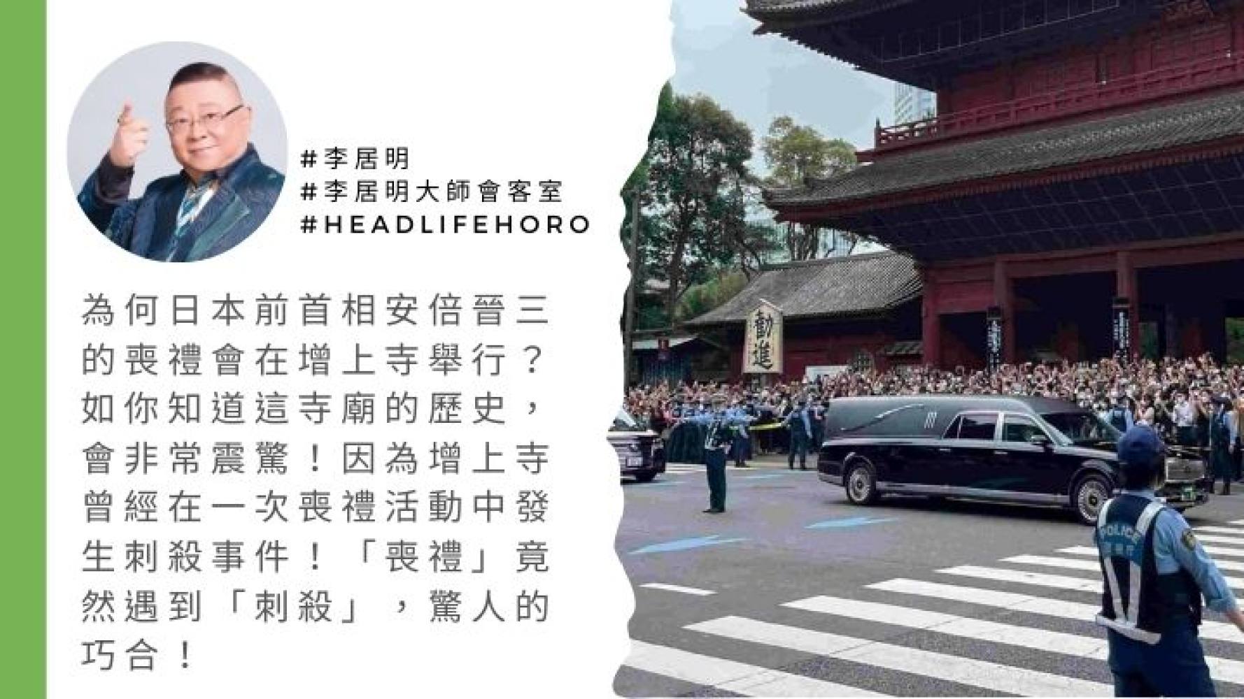 為何安倍喪禮會在增上寺舉行?如你知道這寺廟的歷史,會非常震驚!因為增上寺曾經在一次喪禮活動中發生刺殺事件!「喪禮」竟然遇到「刺殺」,這是增上寺的密碼及宿命!增上寺是德川家康家族的家廟,其第四代將軍德川家綱因病去世,就在增上寺舉行喪禮時,他手下的兩位權臣為爭權,其中一位拿刀將對方刺死,史稱「芝增上寺的刺殺事件」。