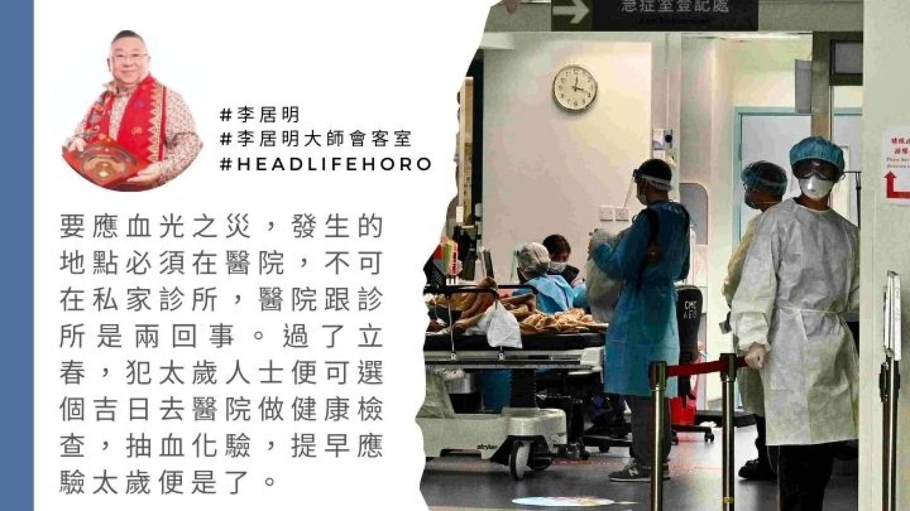 醫院應驗血光之災,也是化解太歲的辦法之一。太歲年如果要應血光之災,可以捐血或洗牙。一定要令自己痛苦才行。要應血光之災,發生的地點必須在醫院,不可在私家診所,醫院跟診所是兩回事。既然如此,可到醫院做一件很不重要的事情,將災劫化泄了。過了立春,犯太歲人士便可選個吉日去醫院做健康檢查,抽血化驗,提早應驗太歲便是了。