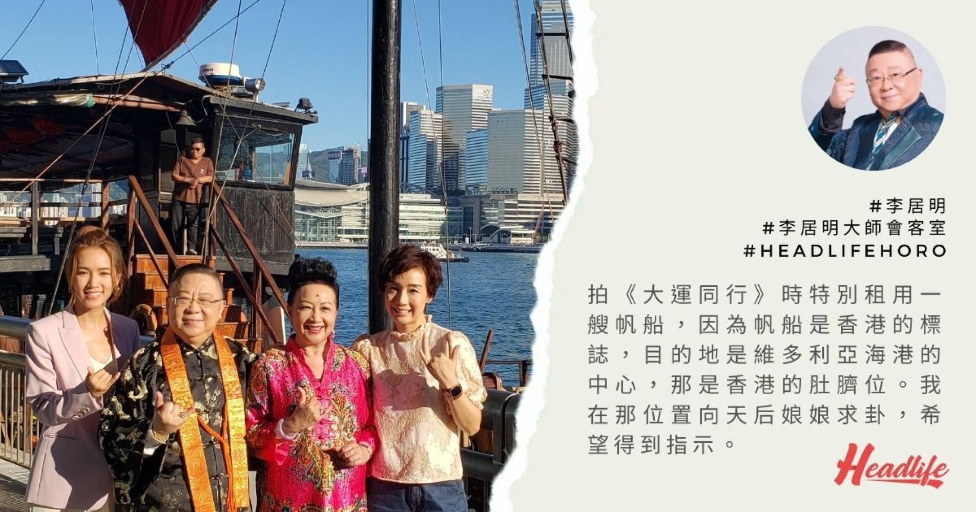 我在今年11月拍攝賀歲電影《大運同行》外景時,特別租用了一艘帆船,因為帆船是香港的標誌,目的地是維多利亞海港的中心,你可能不知道,那就是香港的肚臍位。我在那個位置向天后娘娘求卦,希望得到指示,香港在來年有甚麼運?