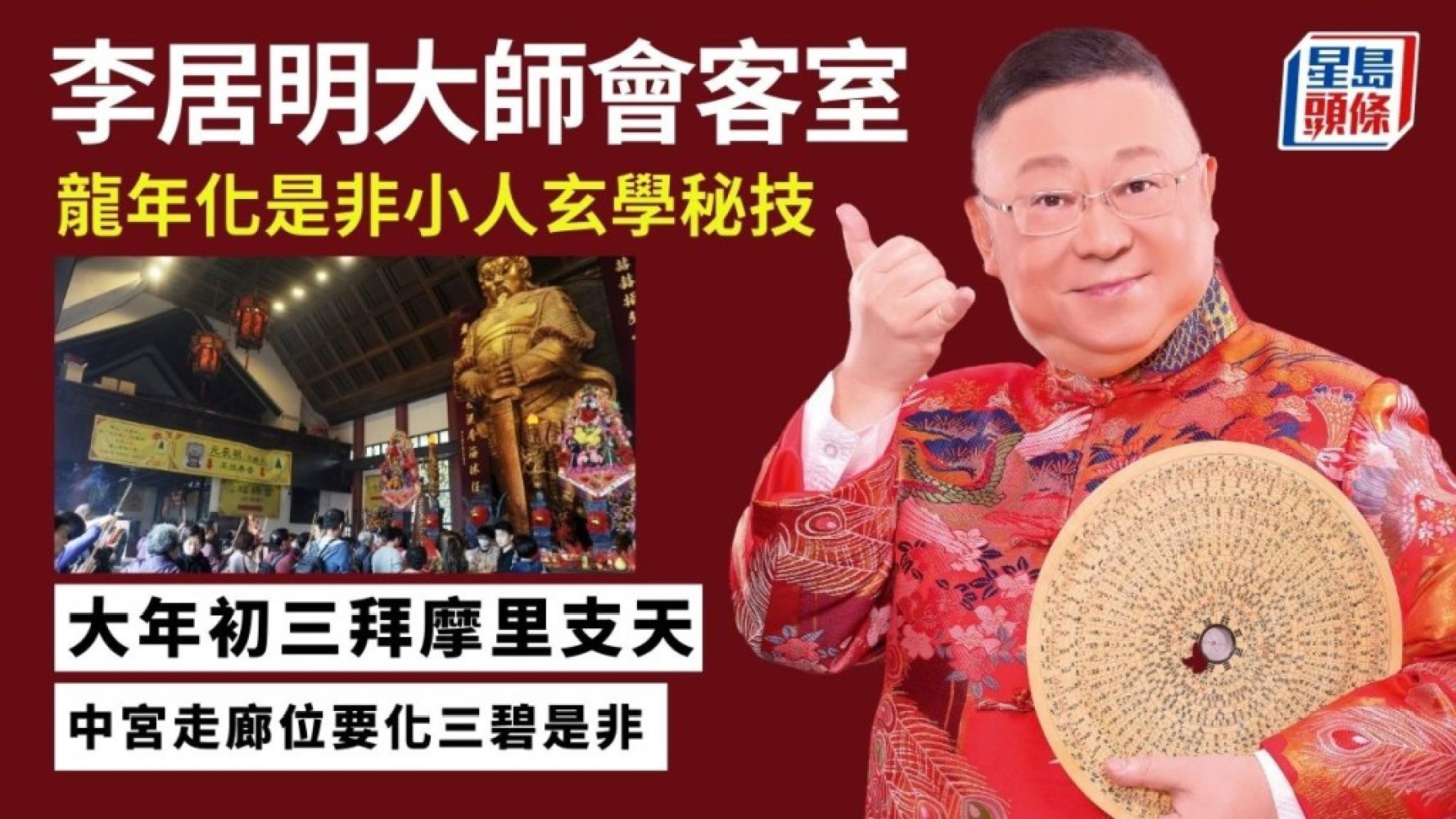 為何要強調大年初三拜車公?因為今年龍年是一個「天羅地網」之年!甚麼是「天羅地網」?其實有四組密碼,就是「辰戌巳亥」。甲辰龍年是一個訴訟年,進入立春後,香港有很多大型法律訴訟要做,也有很多是非小人、家庭爭產對簿公堂的事發生。今年是「是非年」,奉勸大家可忍則忍。