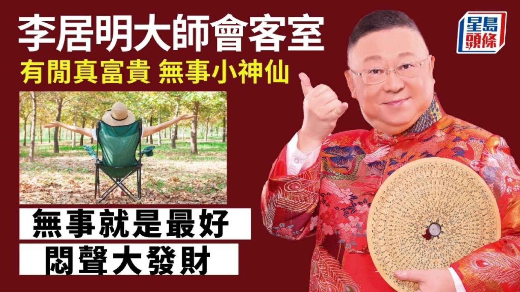 「無事小神仙」,就是沒有甚麼事發生,你等於做神仙。所以我們每一日都要感恩,感恩今天沒甚麼大事發生。最重要是,不要無事找些事來煩!有些人說,活得很辛苦,不開心。你辛苦是因為你比較複雜。人簡單一點,自然就不會很辛苦。我身邊很多人有這種「神經衰弱症」!