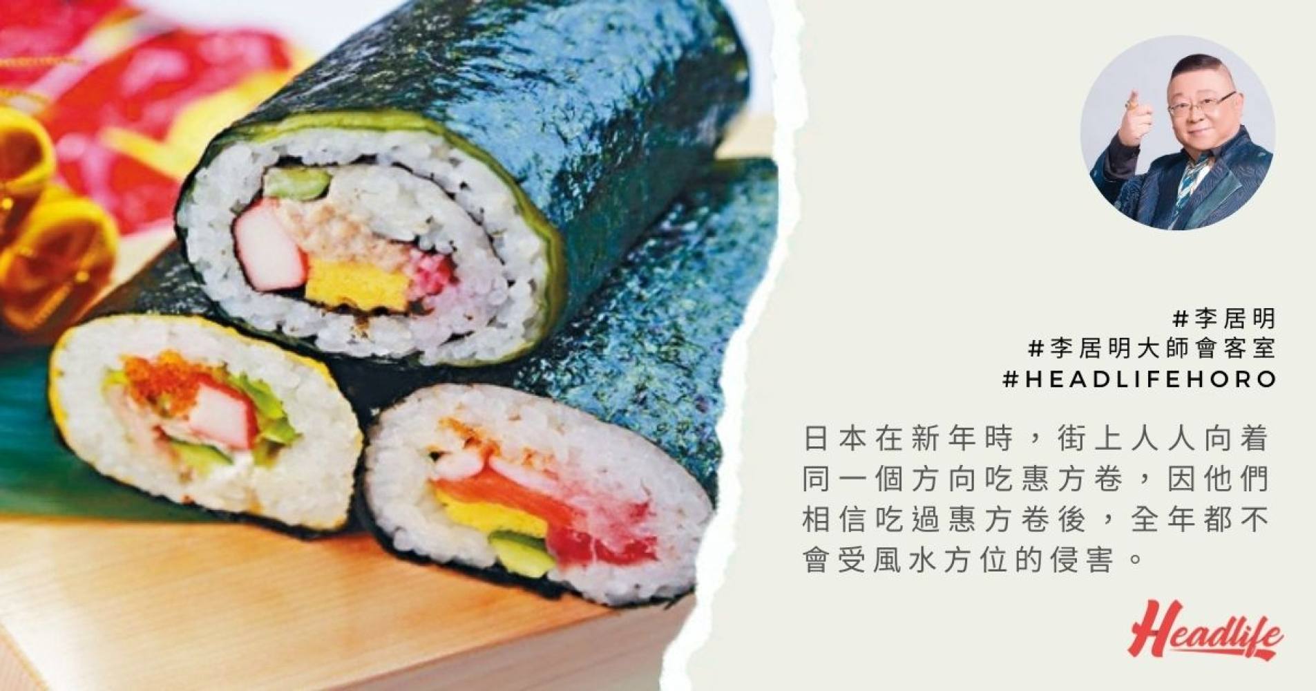 在日本,立春前一天,全日本的7-11都會掛起一個大的牌,寫着「惠方卷之日」!人人都會買一個惠方卷,然後拿出指南針找準「大惠方」才吃。街上人人向着同一個方向吃「惠方卷」,是一個很有趣的畫面。他們相信吃過「惠方卷」之後,全年都不會受風水方位的侵害。中國人懂得用銅錢來化五黃二黑,但日本人只懂得吃惠方卷,而且只在立春前一天吃!