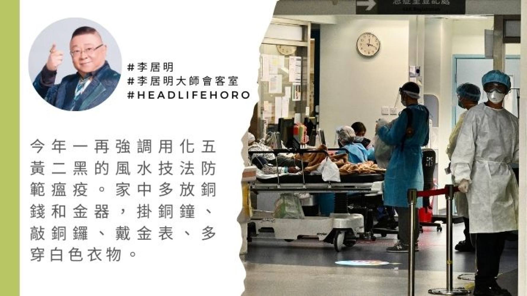 今年一再強調用化五黃二黑的風水技法防範瘟疫。家中多放銅錢和金器,掛銅鐘、敲銅鑼、戴金表、多穿白色衣物。銅箔是避疫至寶。一定要避開深啡色,啡色是瘟疫密碼。香港最坎坷之時,特首穿啡色衣服,財爺的預算案小冊子是深啡色,如果你現在還用了很多啡色的東西,代表你很不好運!暫時藏起你的大型水晶簇,因為那代表瘟疫戌土。鹽是濕土,可散火毒,用鹽水漱口可消毒。
