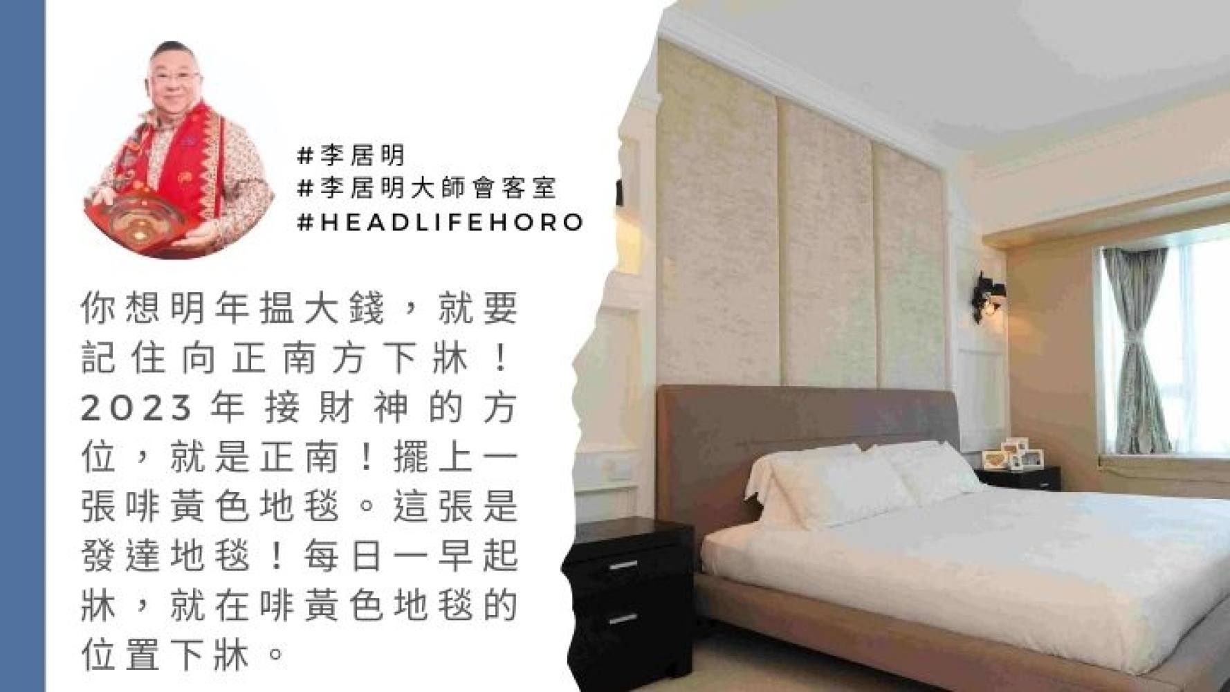 請大家用手機上的指南針,找出你張牀的正南、正北或西南。正南是首選!南方下牀是揾快錢,北方是慢錢,有分別!快錢就是錢快些入袋,慢錢要追回來。所以不必想!大家向着南方下牀,2023年你肯定有快錢!