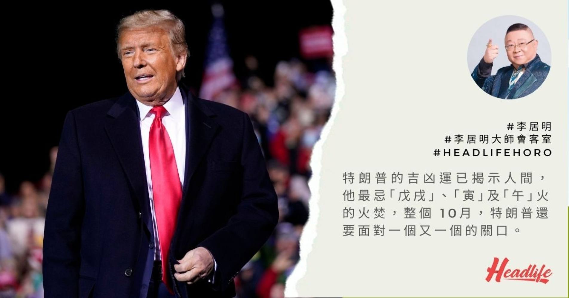前一段日子,特朗普確診新冠肺炎的日期是在「戊寅」日,生於「午」月的他正陷入「子平神數」占算命運密碼中的三合火局——「寅午戌」的密碼之中,已明顯之極。特朗普的吉凶運已揭示人間,他最忌「戊戌」、「寅」及「午」火的火焚。他後來高調現身,明顯已泄氣又氣急敗壞,亂了陣腳。