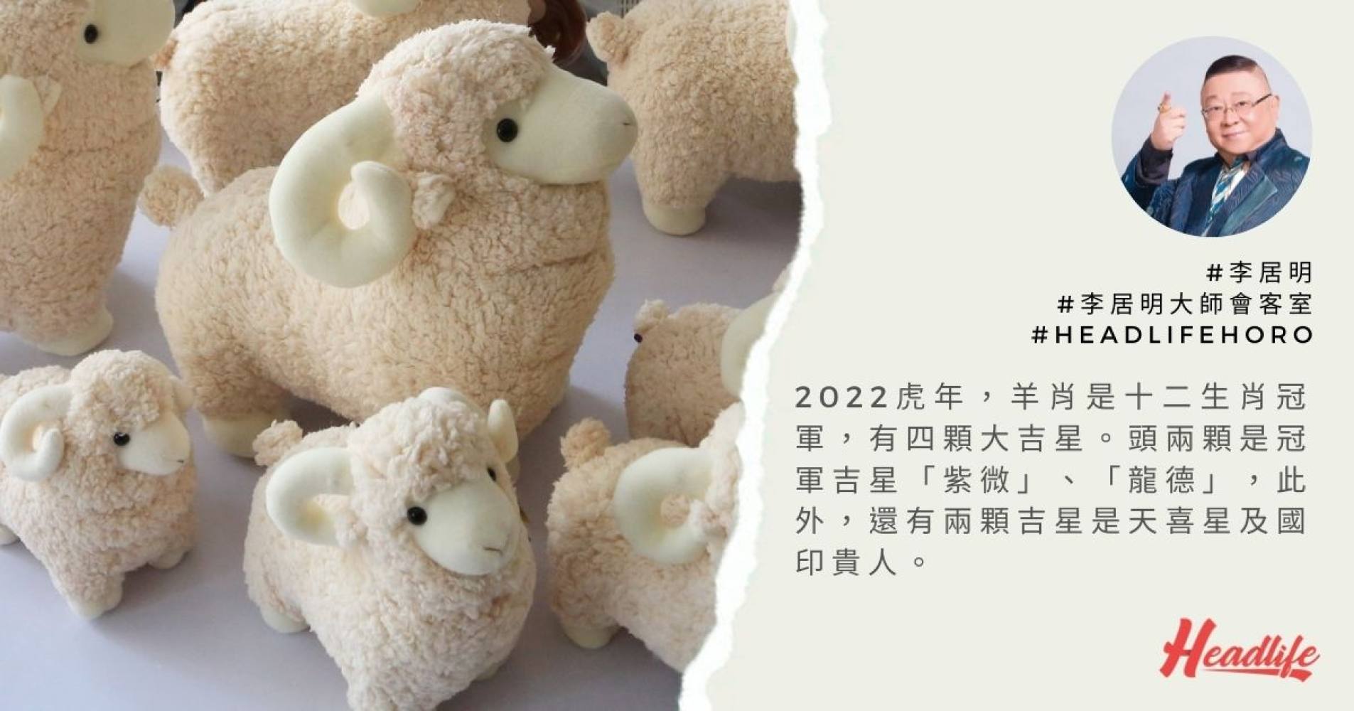 2022虎年,羊肖是十二生肖冠軍,有四顆大吉星。頭兩顆是冠軍吉星「紫微」、「龍德」,此外,還有兩顆吉星是天喜星及國印貴人。
