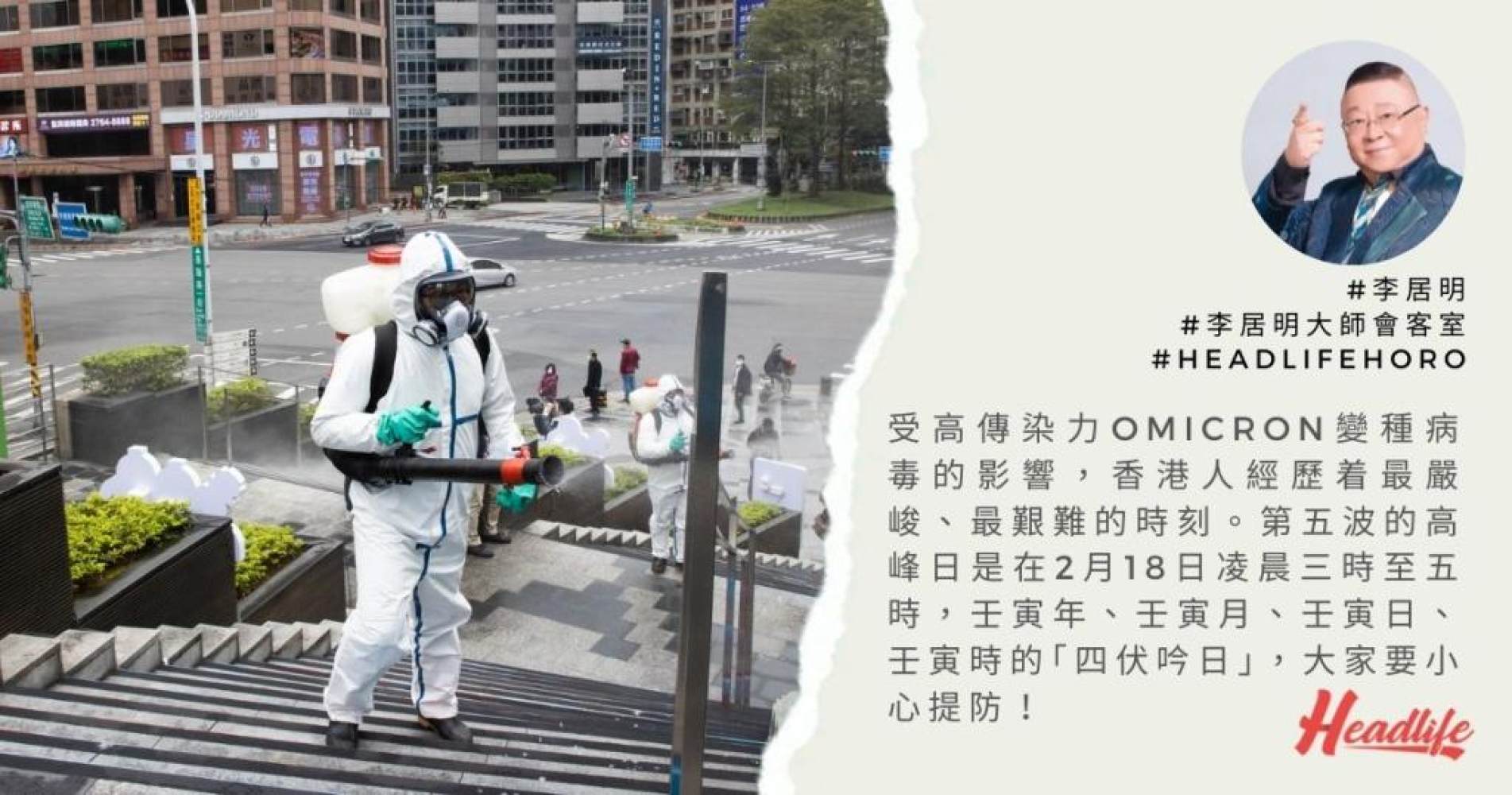 由西曆2月4日起,進入壬寅年壬寅月,與上個月的辛丑年辛丑月,同樣是天干地支都正好重複,連續兩個月的「伏吟伏吟,涕淚吟吟」,受高傳染力Omicron變種病毒的影響,全球疫情達到最高峰,香港人亦是經歷着最嚴峻、最艱難的時刻。第五波的高峰日是在2月18日凌晨三時至五時,壬寅年、壬寅月、壬寅日、壬寅時的「四伏吟日」,大家要小心提防!