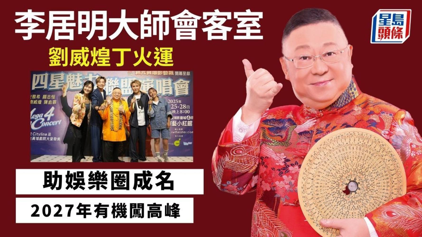 先說劉威煌,「威煌」這兩個字非常了不起,因為從事娛樂圈的人一定要有火,「煌」字有火,再加上「皇」字,即是「火」稱王稱霸。再看他八字,日元庚金,生於金月。庚金男性要成功,一定要靠丁火,即正官運、名氣運。而威煌目前正行入丁火運。所以,威煌的人生高峰還未到,從他面相上亦可證實,就是他的鼻子,準頭非常飽滿有肉,代表他48歲人生最高峰,即2027年丁未年一定登峰!