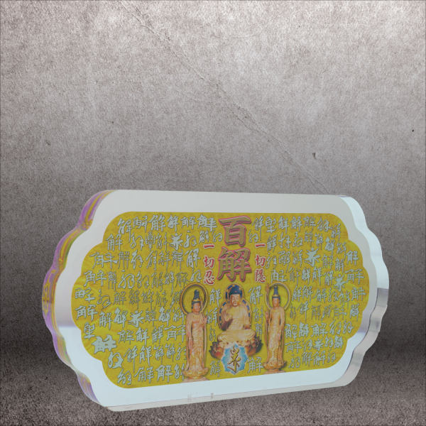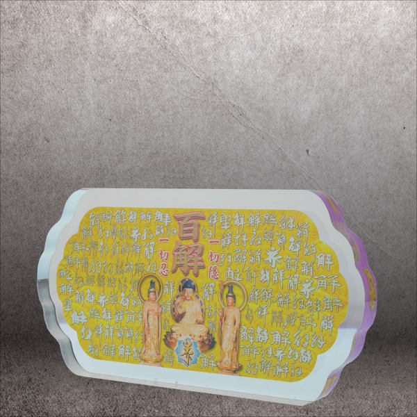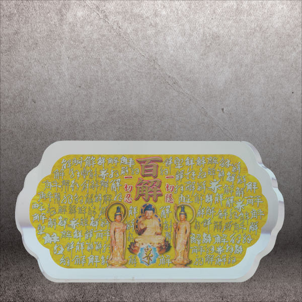 此牌全文刻印「一切如來心秘密全身舍利寶篋印陀羅尼經咒」及三陀羅尼吉祥種子,經云:「此經所在之處,有大功勳,具大威德,能滿一切吉慶,遠塵離垢及隨煩惱」,可供奉於神壇或放置任何地方,即生解脫,諸事圓滿。