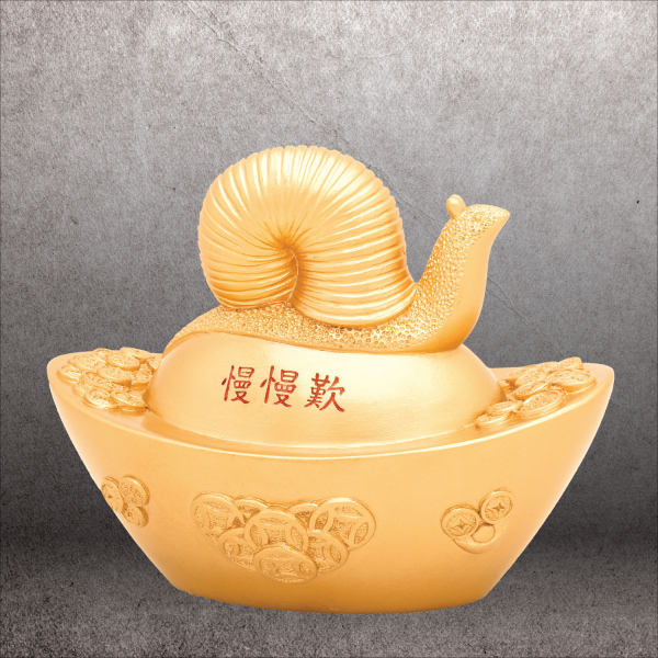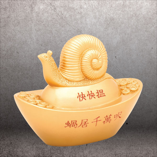 「蝸牛」坐在一隻大元寶上為何?原來「元寶」是代表「三元不敗」,一元是六十年,三元是旺足一百八十年,代表子孫幾代都興旺,稱之為「口卦」,代表財富、地產都可傳給子孫後代之意,家運長久之意。