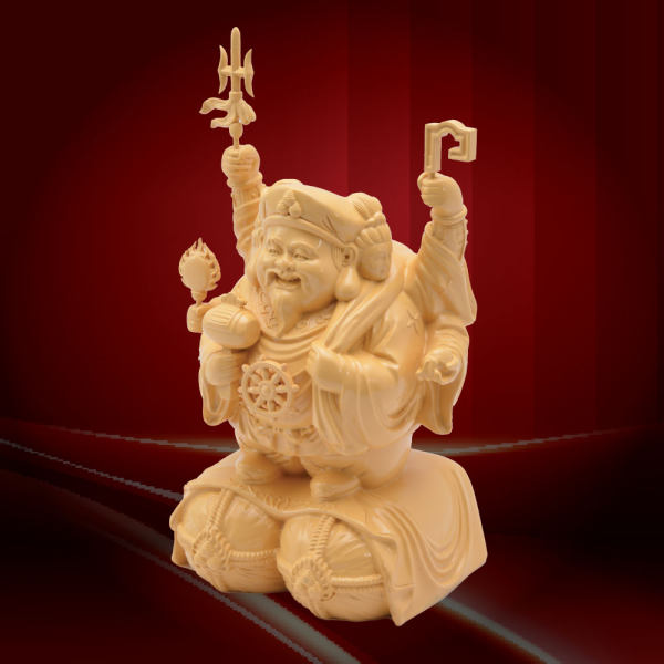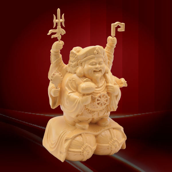 「笑面大財神」其實有三個面,是三個財神合體,亦稱為「三天合行」。前方是肥胖可愛的笑面大黑天、一面是女性財神弁財天、一面是威武男性財神毗沙門天,滿足眾生所有財富要求,亦代表正偏橫三財盡攬。