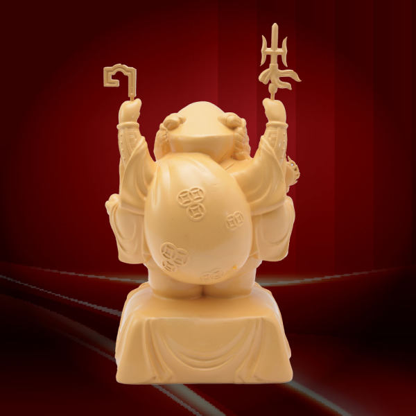 今年面世的笑面大財神,最難得之處,是大黑天胸前有個「如意輪」,真正可以轉動,順轉為「增益」,代表財富入袋,源源不絕;逆轉為「消災」,代表消除財富障礙。一般先逆後順,去除阻擋財運的凶險,再叫「大財神」來!