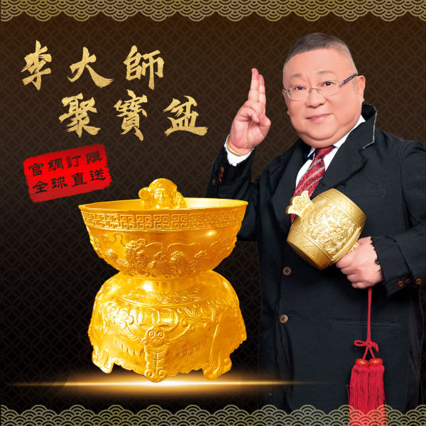 「沈萬山聚寶盆」豬年隆重登場!在即將進入九運之際,李居明大師特別設計金色聚寶盆,內有金色大黑天財神,外有「蝠鼠吊金錢」、「雙獅戲球」等吉祥招財圖騰,並親書財神吉祥梵文加持,金色可鎮宅化煞。